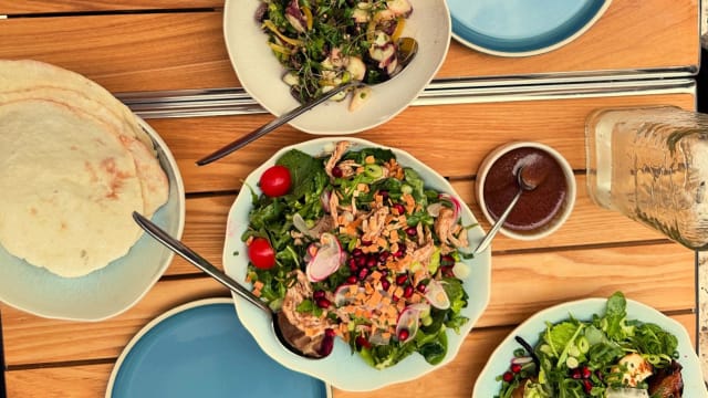 Pourpier, sarriette, menthe, concombre, tomate, radis, grenade, poulet mariné au sumac et laqué à la mélasse de grenade, pain croustillant