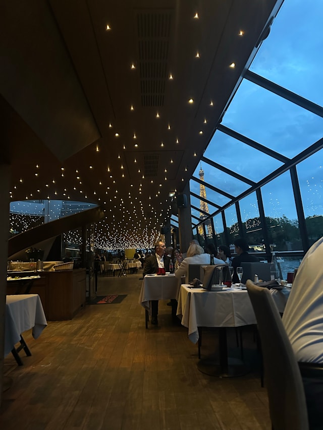 8.5/10An evening dinner cruise on the Seine is a perfect way to enjoy Paris. Les Bateaux Mouches offers two boats each night with upperscale dining and service. Each table lines the windows of the boat and between courses you can go upstairs to enjoy the view. Great value for the experience and full course one price menu including wine.