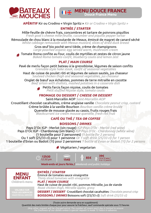 4.5/10The food and services are okay but ordinary. The biggest issue is no air conditioning in such a sealed cabin at noon of Summer. It was very hot and uncomfortable journey, hardly to enjoy meal and views. It was the worst experience of my Paris journey...