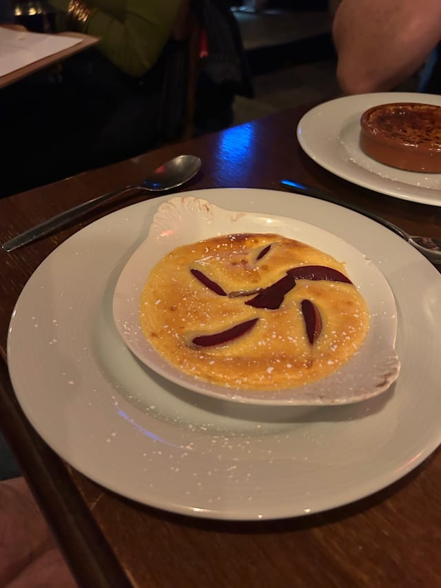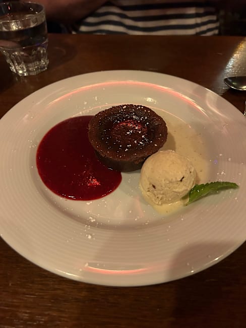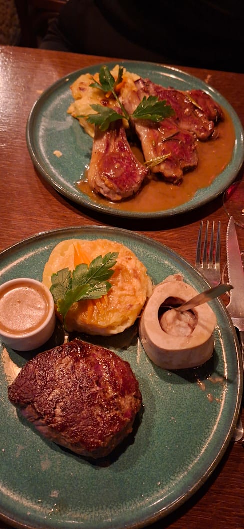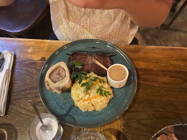 6.5/10The waiter was fun and helpful. The starters (fish soup, muscles, gravalax) and main courses (pork, beef on marrow bone) were incredibly boring and tasteless. Deserts were good (apple crumble) and bad (ice cream).