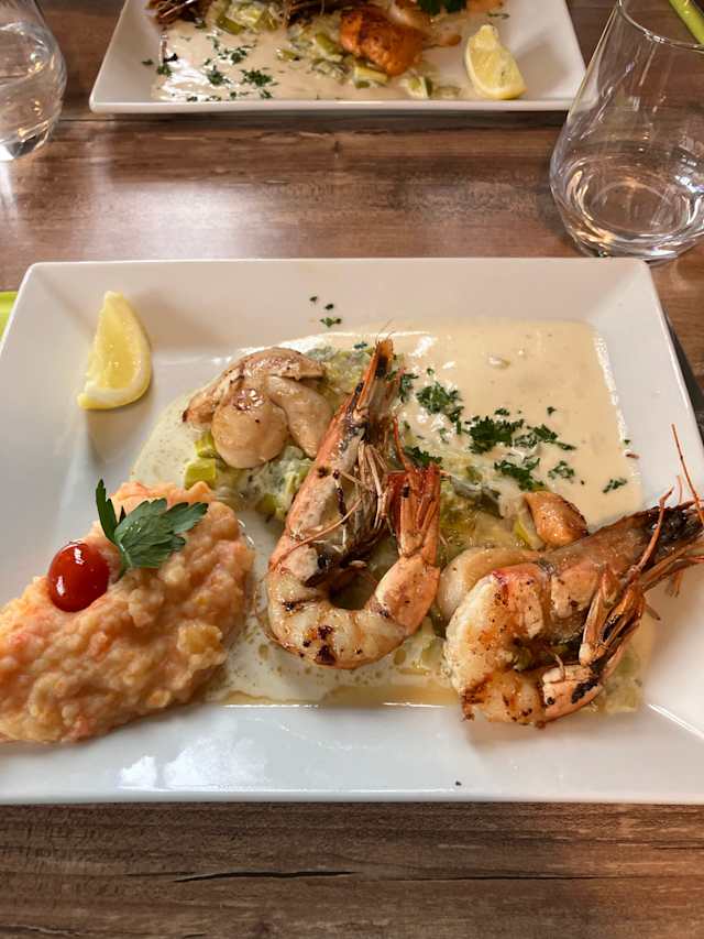 - Trois cuisses de grenouilles et son travers de porc rôti, crème d’ail, röstis, salade