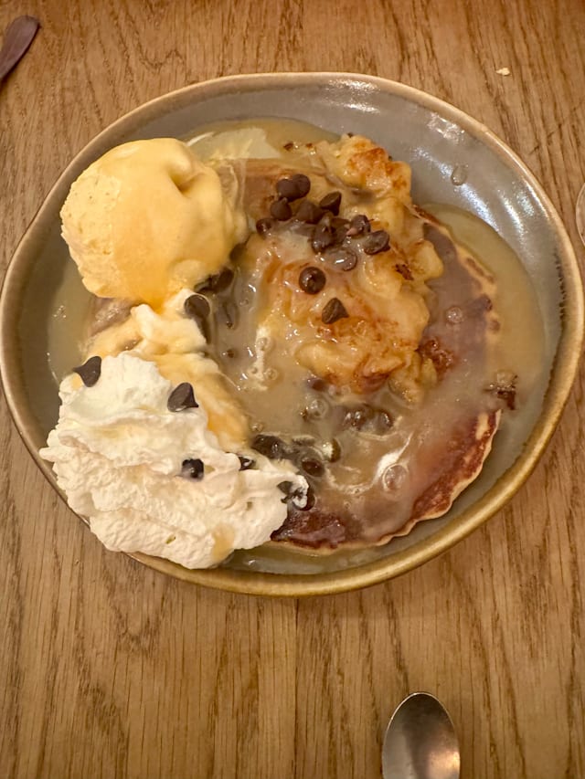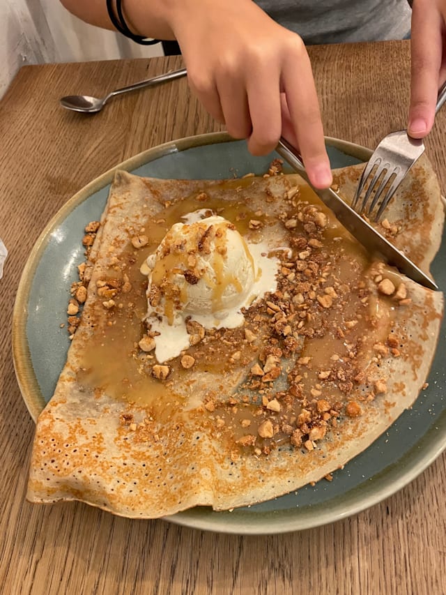 10/10We stopped in for sweet crepes and cappuccino for dessert. I had the Gustave crepe which was amazing.It featured homemade caramel sauce with roasted peanuts and ice cream. My daughter had the Eugene which she also thought was delicious.. The service and atmosphere was very friendly and inviting. We would definitely eat here again.