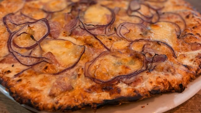 - Sauce tomate, emmental français, jambon, champignons frais, lardons, oignons confits