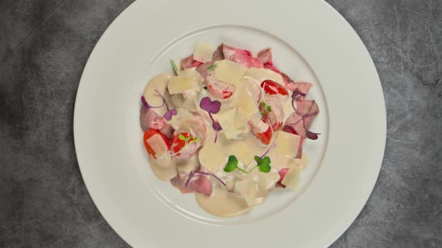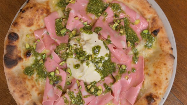 Mozzarella, mortadella, burrata, tomate seco y pesto de pistacho