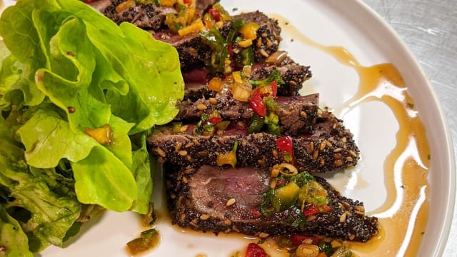 - Saumon fumé maison, tartare de saumon pousses de soja, chou chinois, poivrons, salade et légumes marinés
