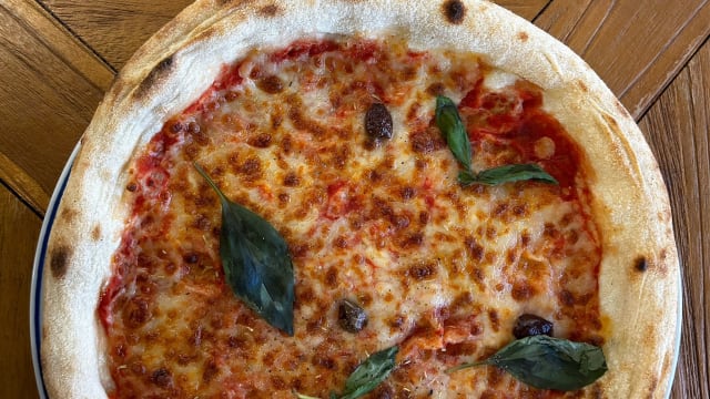 Sauce tomate, mozzarella, tomates cerises, coeur de burrata sublimée d’un filet d’huile d’olive des pouilles, olives, origan.