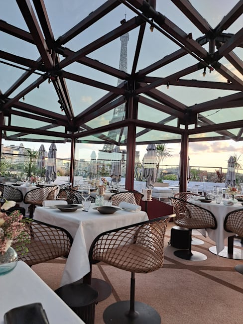 8.5/10The view is awesome, but it’s a photo point, of course. Food looked good, that and the view is where the price comes from, but taste was more average. Service was initially nice, although our first waiter had a really strong body smell (without being rude, that African smell…). But after some while it got messy: multiple waiters for our table, wine glasses ran empty (while the bottle was not next to table, so we really relied on them). Courses came either too fast or took forever. It’s a good place to have dinner with a big view on the Eiffeltower (although the metal construction of the roof is not very practical for the perfect picture). For a Parisian gourmet food experience I’d recommend other restaurants.