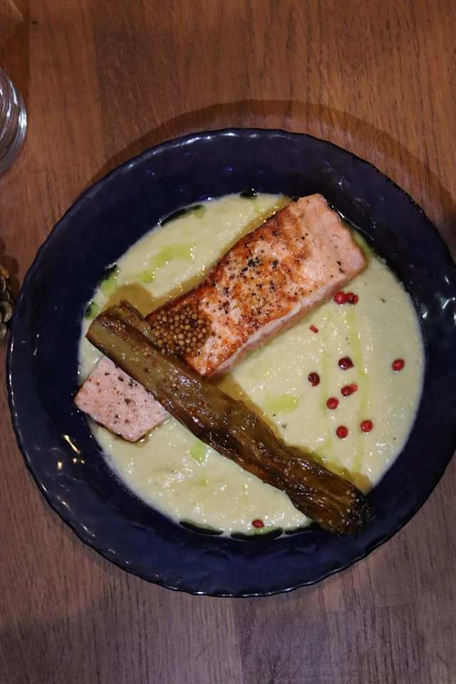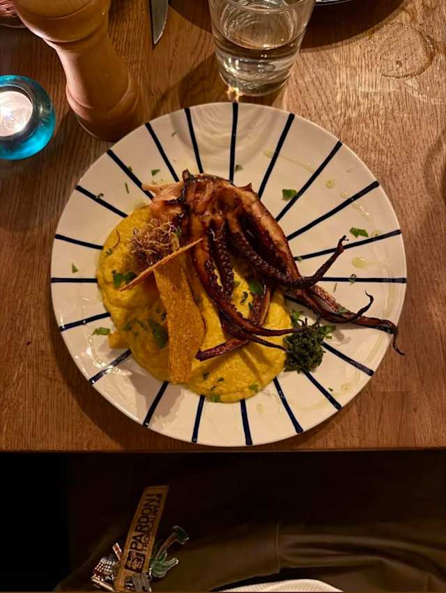 - Tentacules d'encornet, sauce chimichurri, purée de mais, condiment salicorne