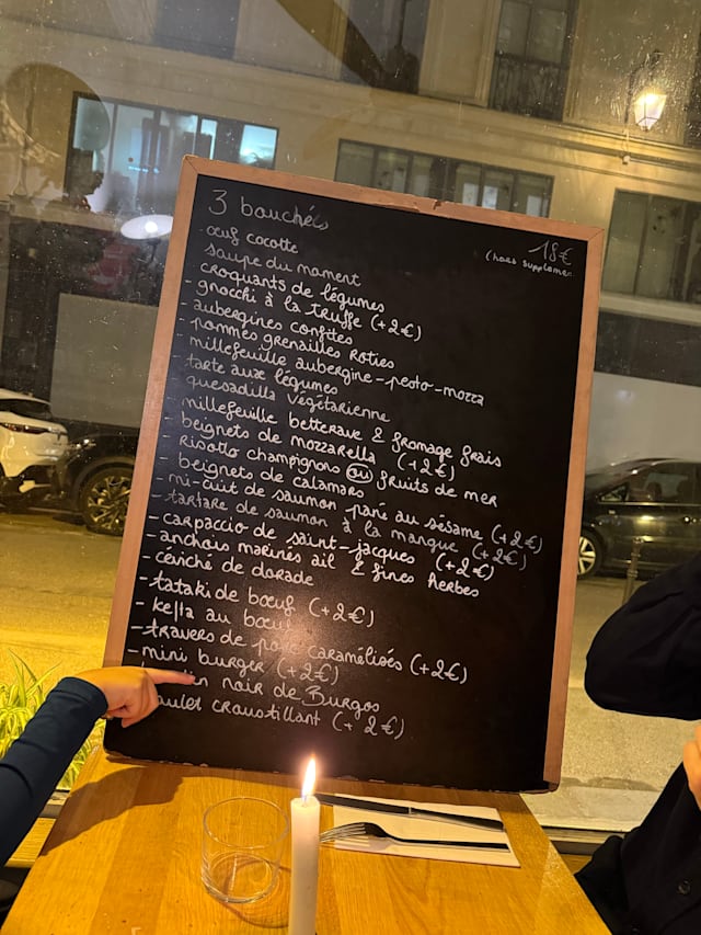 9.5/10This is a small place full of neighborhood locals. They offer a full range of vegetarian options. You choose 3 tapas from a long list for 18E. There was one woman who was handling everything but she was calm and friendly. She spoke English and could reassure us that things were nut free for my very allergic granddaughter. We would definitely return here again. Had a nice stroll to the Place des Vosges after dinner. 👍