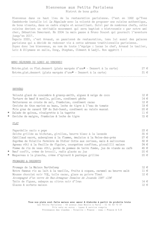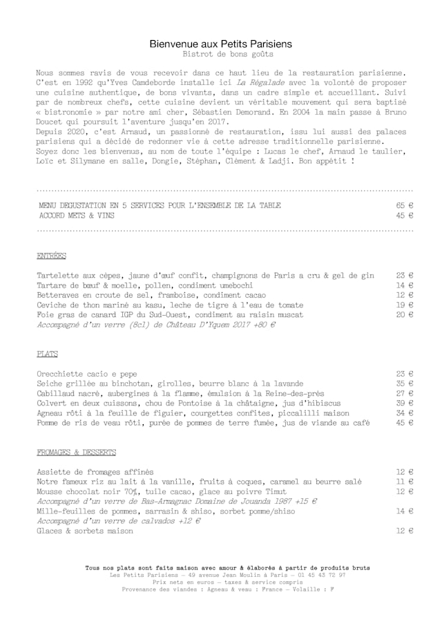 10/10+4I am a regular at this restaurant and I love it more each time I return. Not only is the menu always so delicious and different each time but I feel so welcome, at home and in good hands with Arnaud and his team. This current menu is hands down one of my favorites, everything with morelles was just yummy from the starter with eggs to the pasta and the chicken. The white asparagus, bone marrow and squid ink risotto were also delicious! I'm not a dessert person but the riz au lait is too good not to have. 100% go to Les Petits Parisiens and make it a habit. 😁