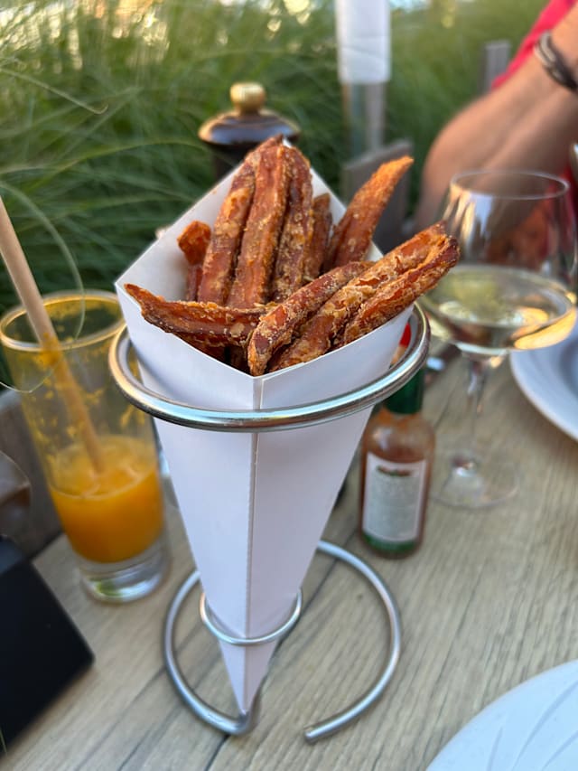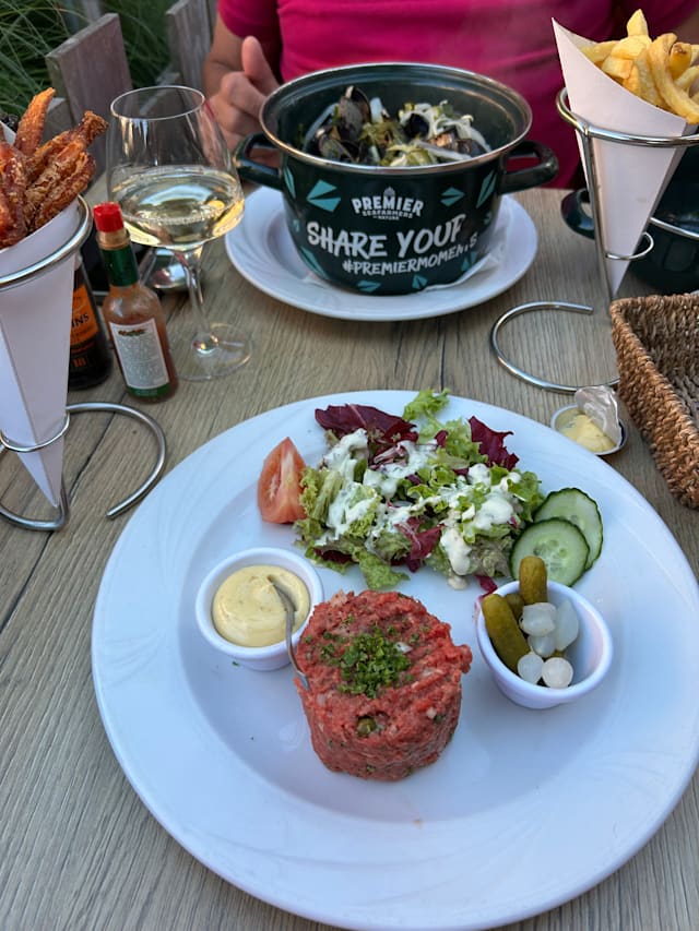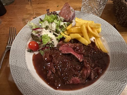 3/10The restaurant was quite full but we got our table after some waiting. Then as non-French speaking couple we felt that we had not same reception and attendance from the waiters. We had to wait very long time for water/drinks (10 minutes) and then additional 30 minutes for our starters. No bread or some snacks during waiting. Then, they took my wife's champagne which was not empty and for the main course mulets (mussels) were all not available on the menu. The fois de gras was very nice but nothing extra. The wine was ok. The meat was very salty and swimming in sauce. Not that good. The chips were just a handful and not very crisp but rather soft. It was not Michelin Bib Gourmand level. Very sad to pay that much money and feeling pressed I gave a larger tip than I should have. Not recommend this restaurant. Possibly only for local people.