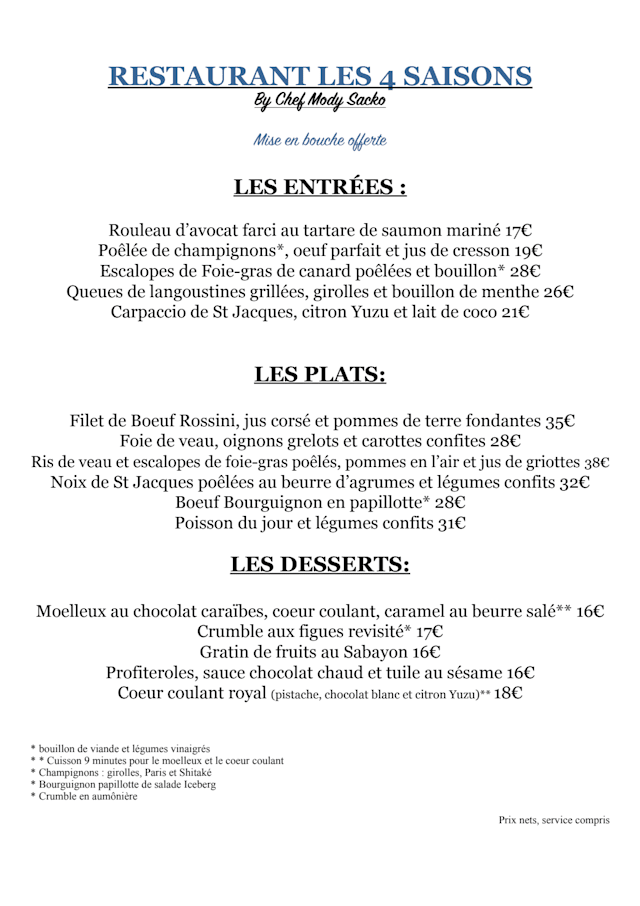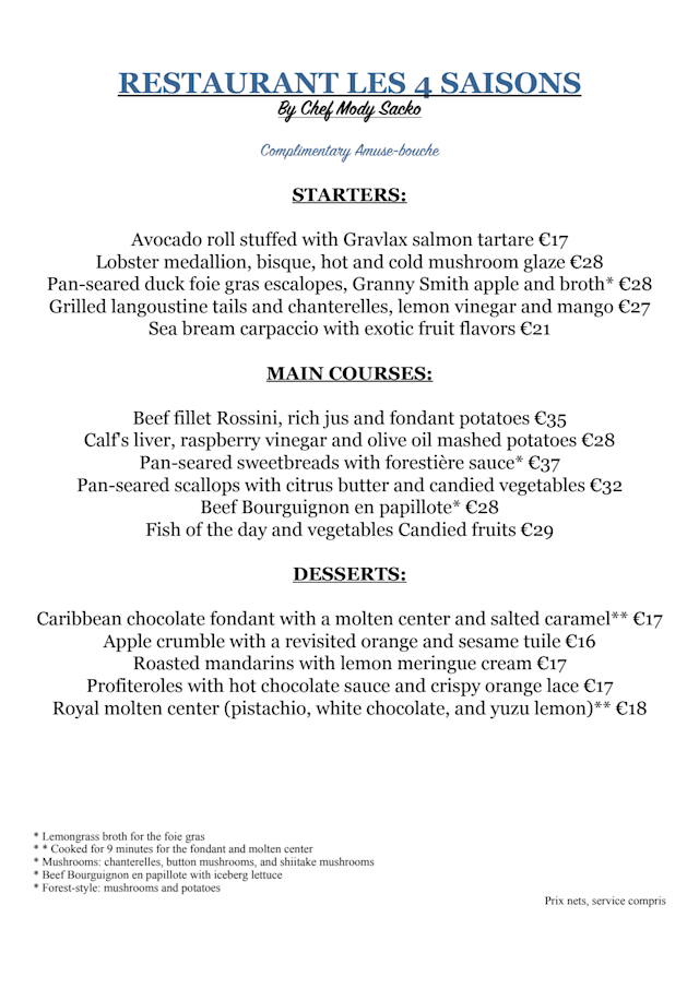 10/10I was absolutely blown away by Les Quatres Saisons. The food was superb. The service was just fantastic. We sat at a table at a window on the second floor, overlooking the street - the ambiance was charming. My wife had a scallop dish that balanced flavors impeccably. My ris de veax was the best I've ever had. The wine list was short, but amazing. I'd do there again tomorrow if I could, and will for sure the next time I'm in Versailles. Is there were more stars that five, I'd give those, too.