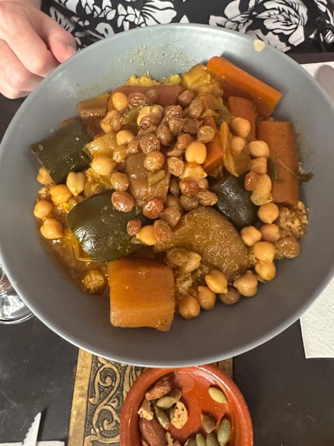 10/10A perfect meal! The roasted chicken with potatoes was perfection. The couscous was lightest and most delicate I have ever eaten. Do not miss the home baked Moroccan pastries & Moroccan mint tea at the end. Restaurant is small and cozy, and you will be encouraged to relax and savor the experience.