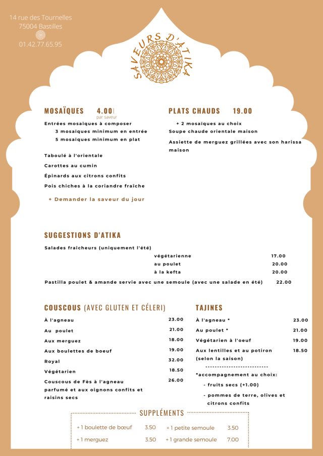 10/10We love Les Saveurs d'Atika. It is a hidden gem in the Marais. We have eaten hear multiple times while in Paris. It is a small, but lovely spot where you feel welcome and are well fed. Three generations of my family have enjoyed this family-run restaurant. The food is soulful and delicious, from the mosaic of small sides to the simmering tagines and hearty bowls of cous cous. The wine list is small, but we quite enjoyed the Moroccan vin gris. We will visit again on our next trip to Paris.