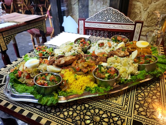 10/10The hidden, covered alleyway is intriguing and fun … and then this restaurant is a gem. Warm and inviting, the service is delivered with evident love. We used our very rudimentary French and the gentleman was so kind and did everything with pleasure. The tzatziki is absolute perfection. The bread is soft and full of flavor. My husband had the Lebanese “gourmand” plate which had a sampling of everything. It was phenomenal. I had the chicken tagine with fig, prune, apricots, raisins, and almonds. It was rich, not too sweet, but full of flavor, and the fig perfumed the entire meal. The meat was melting from the bones. One of my favorite meals in Paris.