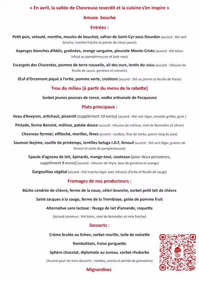 Such a good place for a lunch, not too far from Paris. Excellent and very high quality of food and services. The vin was fantastic and well recommended for the food we ordered. Totally convinced by the charm of the surrounding environnement of the Vallée de Chevreuse