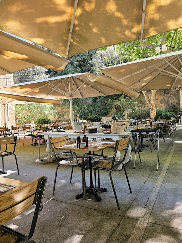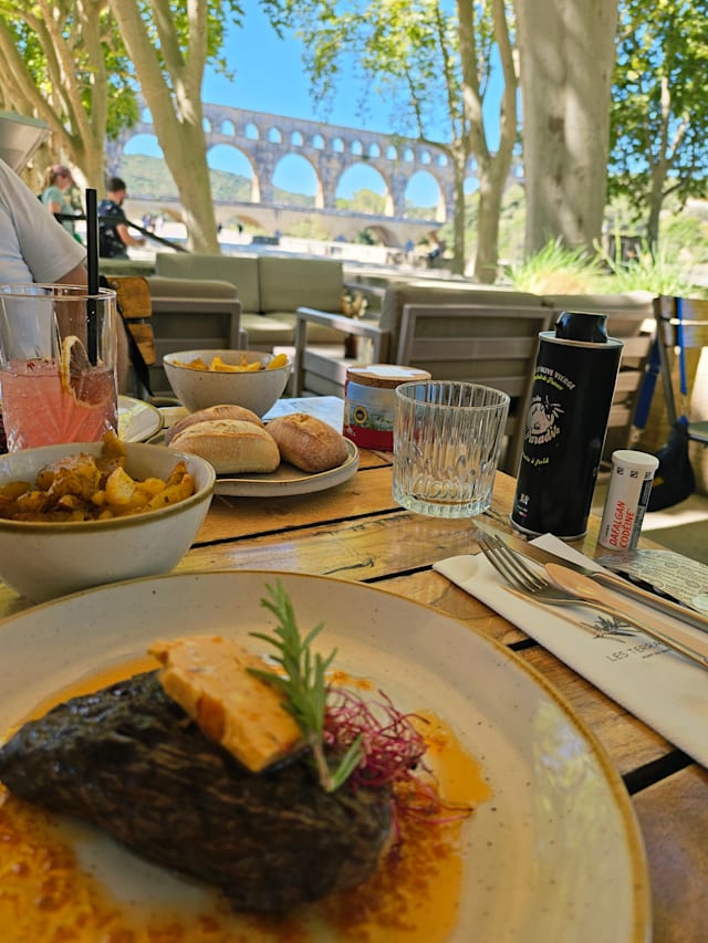 4.5/10Starting with the good: The location right next to the pont du gard is beautiful, awe-inspiring and definitely, absolutely worth visiting. But do yourself a favour and skip Les Terasses. Grab a beer at Les Petite Terasses or an ice cream, both the beer brewed locally and the ice taste great. Les Terasses on the other hand tastes of pre-canned, sad sauces, served absolutely cold, with some of your microwaved side dishes arriving after you're done with the rest of your dinner. I will say that the wine was good though.