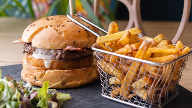 Bun's de notre boulanger, crème d'oignons confits à la bière et au miel, lard grillé, chèvre, tomate, viande au choix. Salade + frites maison