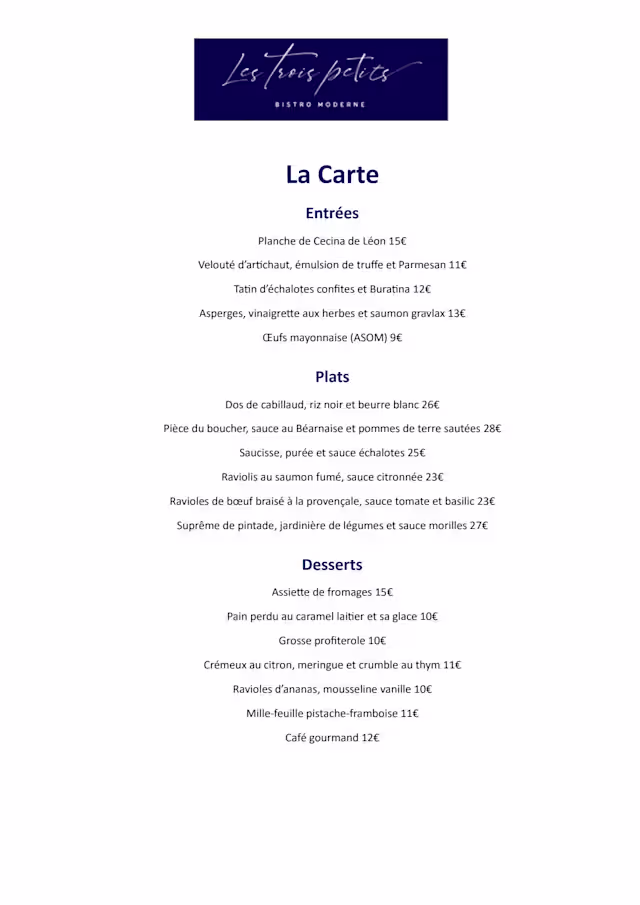 Les Trois PetitsBonjour 😊 Un immense merci pour cette superbe note et votre recommandation ! Nous sommes ravis que les plats, le service et l’ambiance aient pleinement contribué à votre dîner. Votre satisfaction est la plus belle récompense pour notre équipe. Au plaisir de vous accueillir de nouveau très prochainement. Edouard