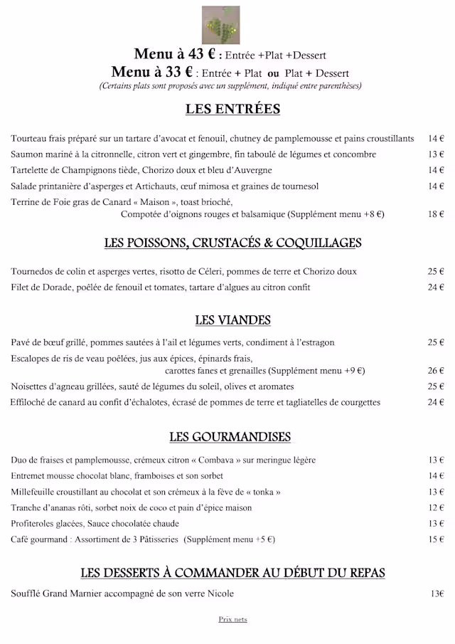 Our stay at Les Vendanges restaurant was an unforgettable experience for us. We were greeted with a smile right from the door and were taken care of throughout the entire dinner. We chose the menu option for 33 euros, which included a main course and dessert. However, both the amouse bouche and the additional refreshment at the end of the dinner were a nice surprise. Each of the ordered dishes tasted excellent and was presented equally well. The wine selection by the gentleman serving us was excellent. We are delighted with both the taste and the atmosphere created by the staff. It was a beautiful ending of our adventure in Paris. Merci beaucoup.