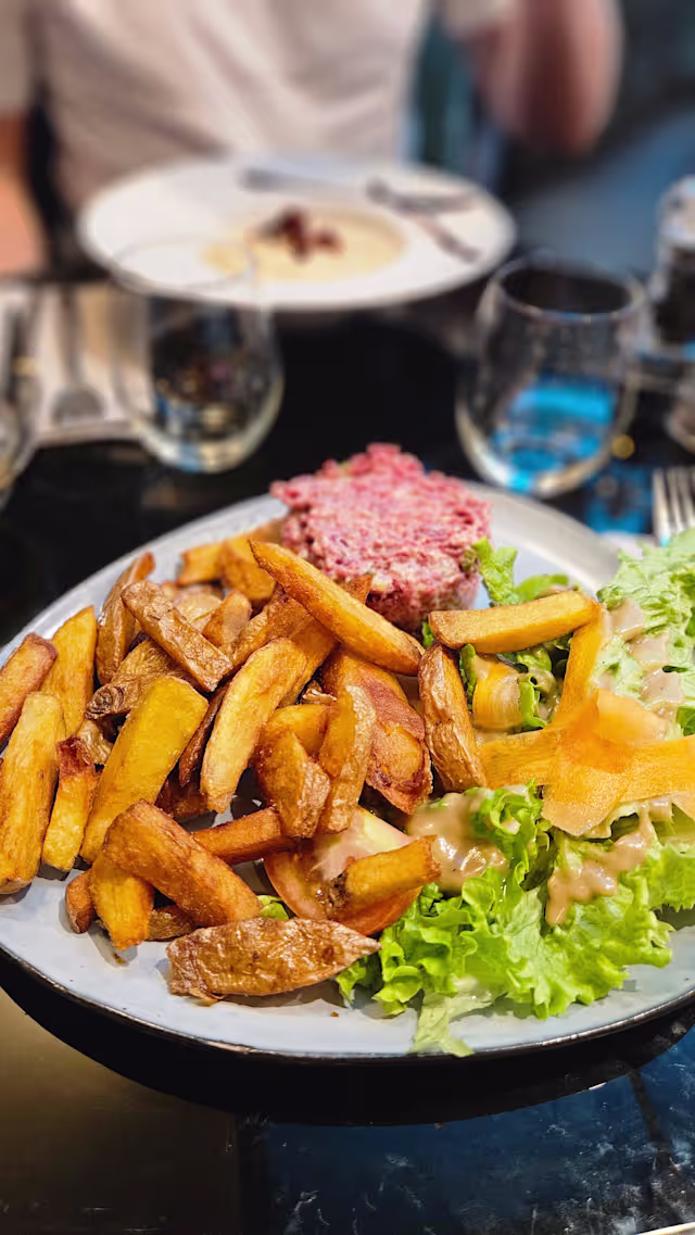 - Bœuf d’origine France, câpres, cornichons, mayonnaise maison, sauce anglaise et tabasco, accompagné de frites et salade verte