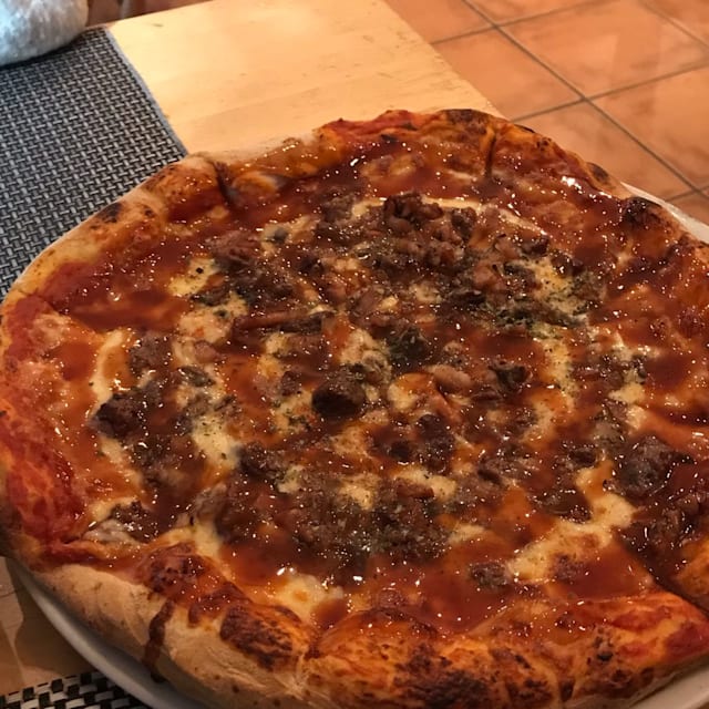 Tomate, mozzarella, carne de ternera, bacón, cebolla y salsa barbacoa