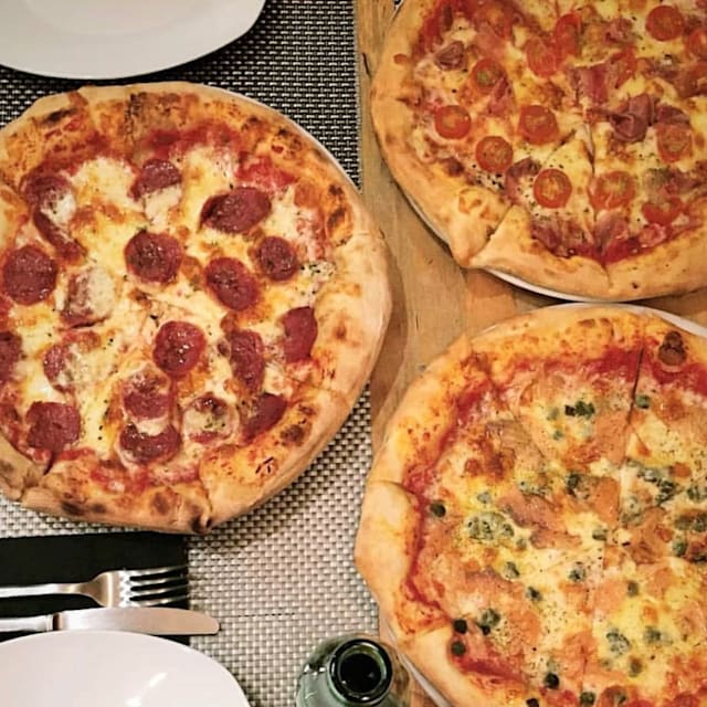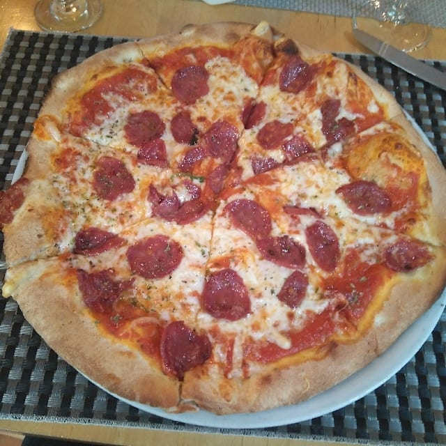 Jamon York, pepperoni, chorizo picante, anchos, champiñones, queso de Gorgonzola, aceitunas negras, alcachofas, maíz.