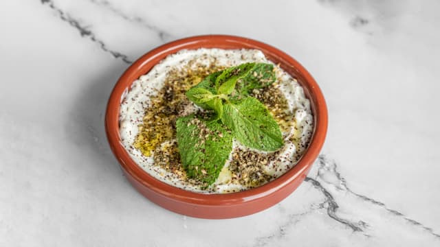 Fromage blanc libanais, aubergine farcies de noix avec les accompagnements du chef