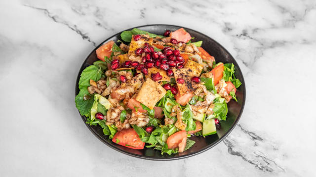 Salade, pourpier, radis, menthe, persil, tomates, oignons, concombres, épices, pain grillé, jus de citron, vinaigre, huile d'olive, mélasse de grenadine