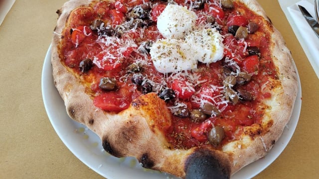 (Pomodoro, fior di latte, alici, capperi, origano, olive)