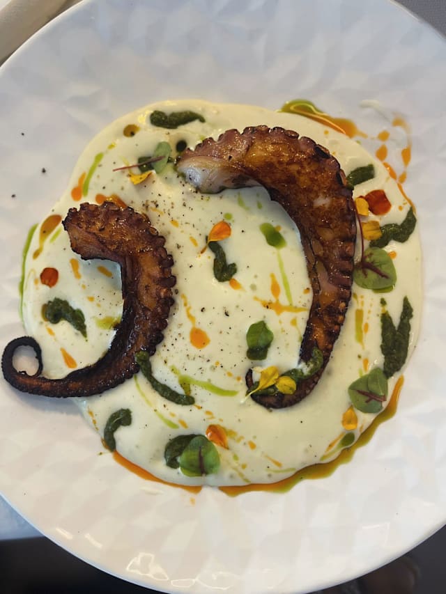 Polpo arrosto con spuma di patate, crema di prezzemolo, olio alla sardella