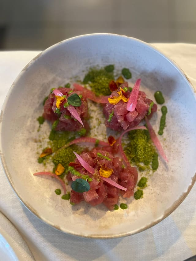 Tartare di tonno, cipolla di tropea, crema di salicornia, crumble di pane