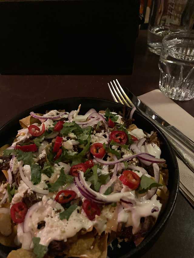 2 st x 15cm vetetortilla med tunt skivad entrecote, ost, avokado, hackad lök & koriander. Serveras m. salsa verde