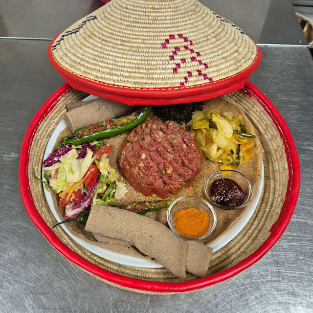 Piatto composto da tutte le sfumature della cucina etnica. I sapori forti dello zighinì e quelli delicati del mincet abish. Servito con misr, iro, alicia. Servito con injera