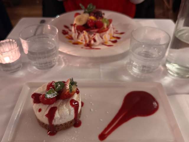 - Meringue croquante, fruits frais, coulis de fruits rouges, chantilly vanillée