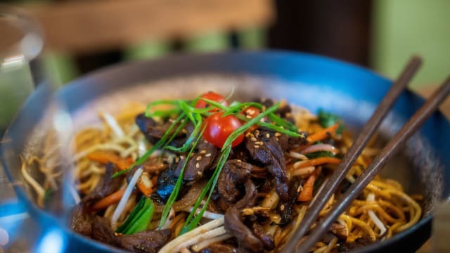Bœuf, poulet sauté au wok en sauce sucrée-salée.