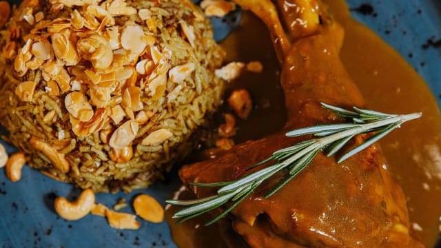 Jarrete de corderov al fuego lento con arroz aromatico y frutos secos.
