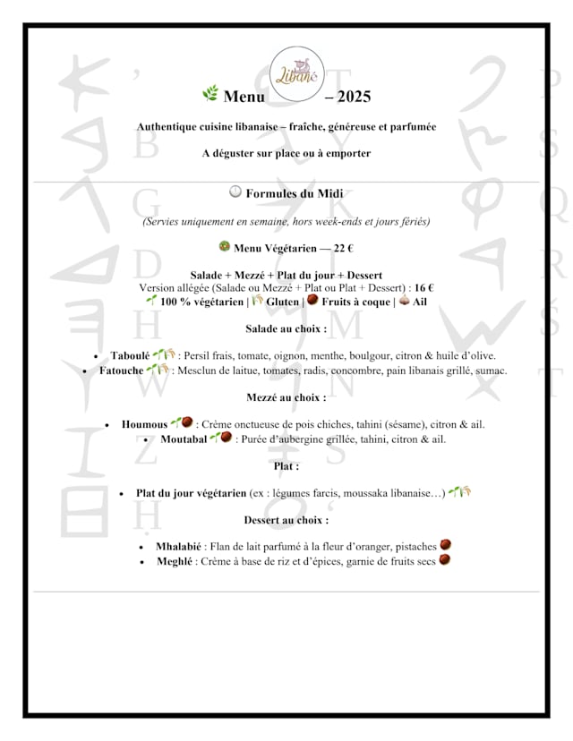 LebaneseMeat CuisineMediterraneanTraditional cuisineVegan cuisineVegetarianMiddle EasternBachelor partyBirthdayContemporary cuisineFine DiningGood for a business lunchGood for familiesLunchOutdoor diningRomanticTraditionalWith friendsGluten freeHalalVegan dishesVegetarian dishesCellarDog-FriendlyWheelchair AccessibleWifi