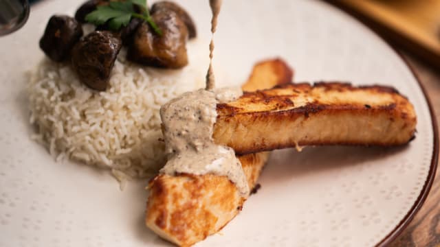 - Roasted chicken fillets, mushrooms and porto sauce, sauteed mushrooms, rice