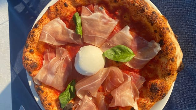 Salsa di pomodoro san marzano, burrata di andria, prosciutto crudo di parma DOP, basilico, olio evo