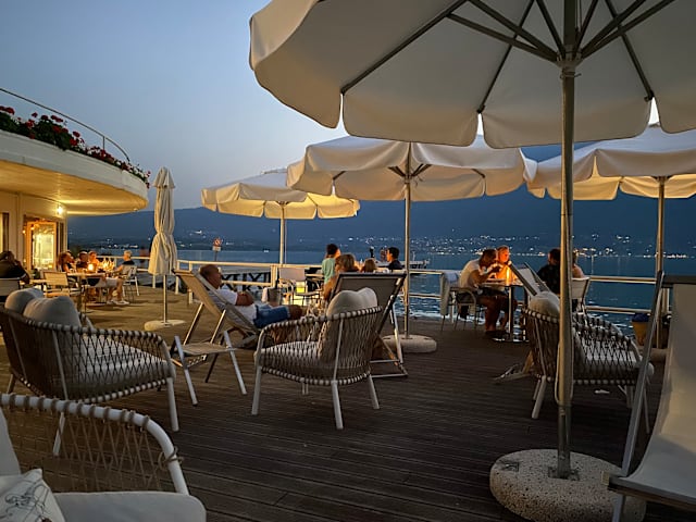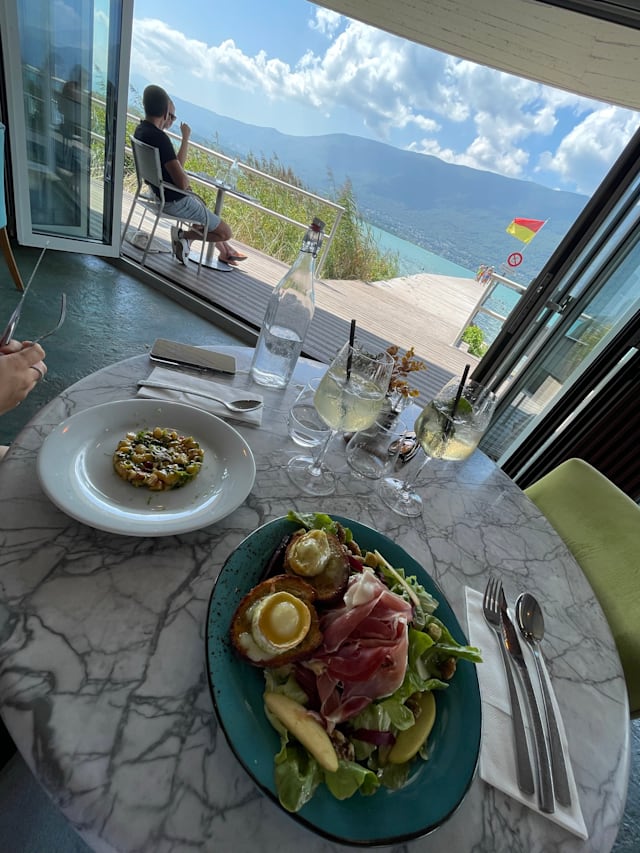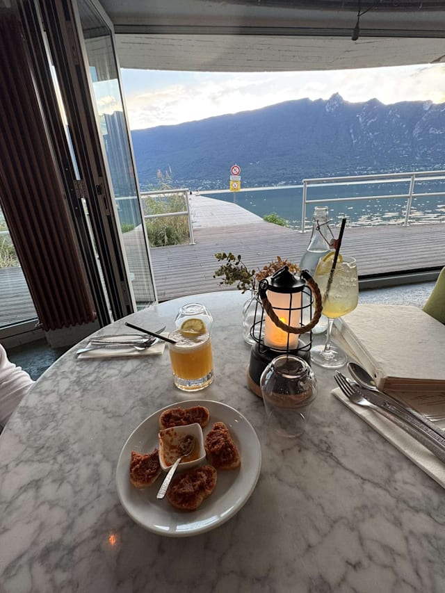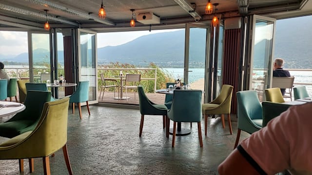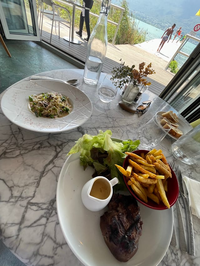 3.5/10We had high expectations of this well-placed restaurant for our Sunday lunch. Only two positives come to mind - the view, and the English waitress that allowed us to select our table. The rest is all bad. I had 'veal', which was over-cooked and tasteless. My wife had cooked vegetables, which can only be described as horrible - both to look at and were way too salty to eat. Our son had a burger, which was at least edible. The red wine we were served was 'cloudy' - full of particulates as though it hadn't been filtered. When we queried this, our 'expert' waiter (irony) told us that all good wines are like this - trust me, they aren't. And finally, that leads me to the waiter, who was probably one of the least professional, courteous, or knowledgeable, I've ever encountered. Rude. Unpleasant. Ignorant. It really is a shame, as this restaurant is ideally placed by the lake. But perhaps that's the problem - the location is all. Food comes second. Service comes third. Our advice - go somewhere else, or take a picnic and eat on the beach.