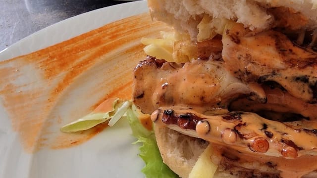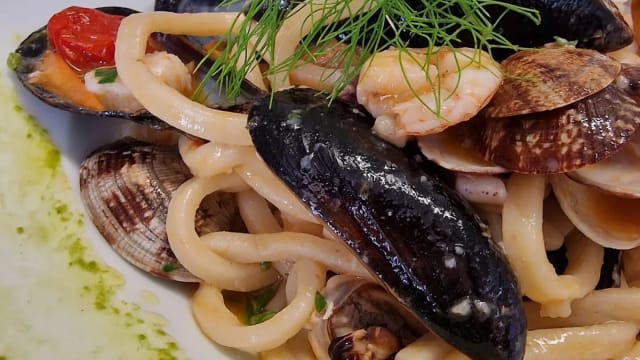 Anelli di calamari fritti, mozzarella, zucchine alla scapece, mayo