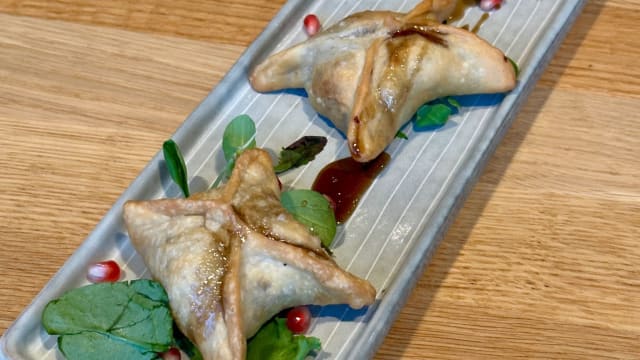 Halal | gefrituurde wanton (deegpakketjes) gevuld met kip en garnalen in licht pittige anan-dipsaus.