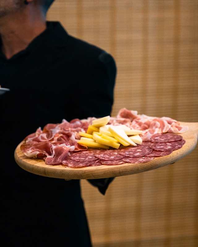- Pomodoro giallo cotto a fuoco lento, provola affumicata in acqua, melanzane in doratura e salame nostrano. In uscita: ricotta affumicata crotonese.