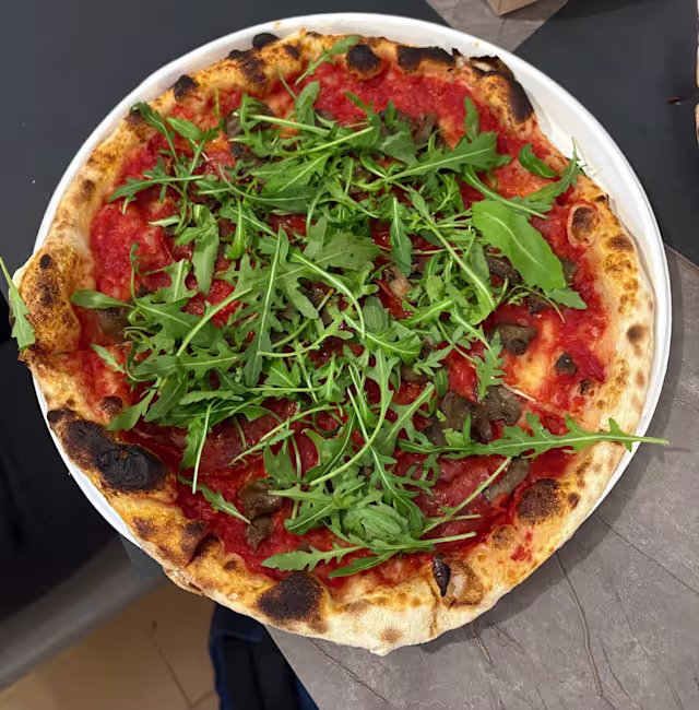- Tipico impasto napoletano, crema di cime di rapa condite in padella, provola affumicata in acqua, salsiccia a punta di coltello, melanzane dorate e fritte. Servite con basilico all’uscita.