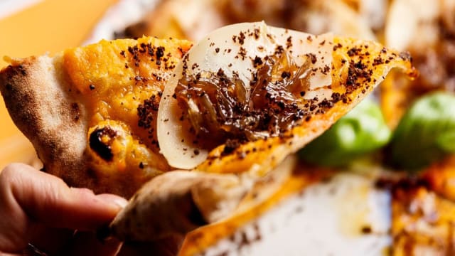 Tuorlo di zucca, prosciutto crudo di parma DOP croccante, fiordilatte di agerola, pecorino romano DOP e pepe nero macinato fresco