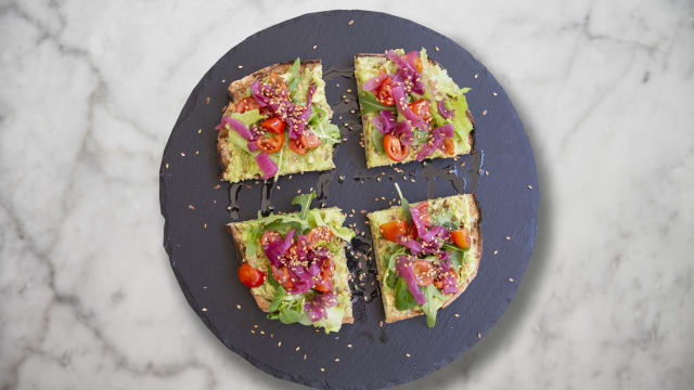 Melanzane, zucchine e peperoni grigliati, patate di avezzano schiacciate, cipolla rossa, pomodorini datterini, polvere di olive nere, basilico e menta