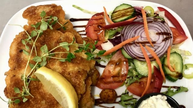Panerad och friterad fisk. Serveras med pommes och remouladsås