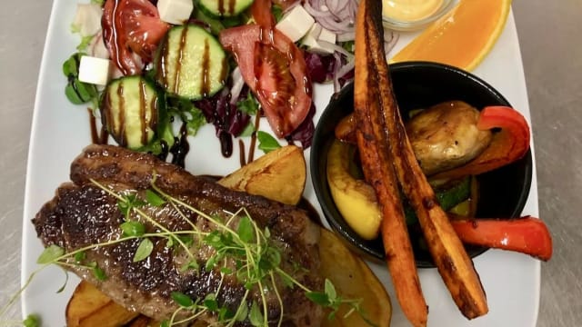 Grillad ryggbiff, serveras med klyftpotatis, stekta grönsaker, rödvinssås och bea