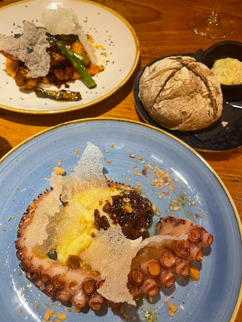 8/10The restaurant is nice and cozy. The service is very good (thank the Californian girl as she was very attentive). I just have some mixed feelings with the food: the padron pepper, feta croquettes and cheese and charcuterie platter were very nice. The pulpo was fine, but the octopus itself was a bit cheawy (thats just the quality), however the pure underneath was a bit plane, maybe missing some flavour. Then we ordered the duck and the pinsa. The duck was our mistake, as for some reason we expected a duck and not what is served. But even that, we didnt really like it (but maybe you do!). The pinsa was great and tasty. The desserts we really didnt like: the chocolate cake was not my type and the fennel on the cremebrule... simply didnt fit. Not sure, maybe it was our mood but some of the food (not all) was not very pleasant and we didnt even finish it (which for me its very weird). I dont think i will come back but i dont regret coming, it was still a nice evening trying it out. Thank you!